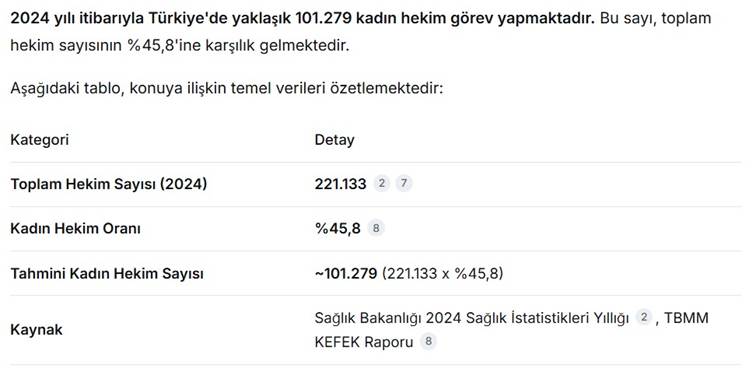 2024 yılı verilerine göre Türkiye’de 221.000’i aşkın sayıda hekim bulunmaktadır. Bu hekim kitlesinin % 45’ini kadınlar oluşturmaktadır.